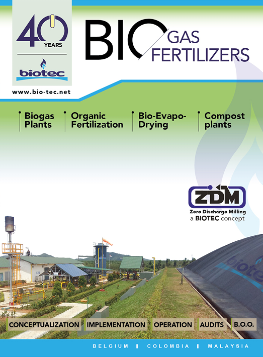 On the other hand, these by-products have a high fertiliser value and energy potential. The bio-digestion of the “POME” in bio-digesters of the BIOTEC RAC model generates an average of 15 m3 of CH4 and 60 kWh per ton of fruit (FFB).